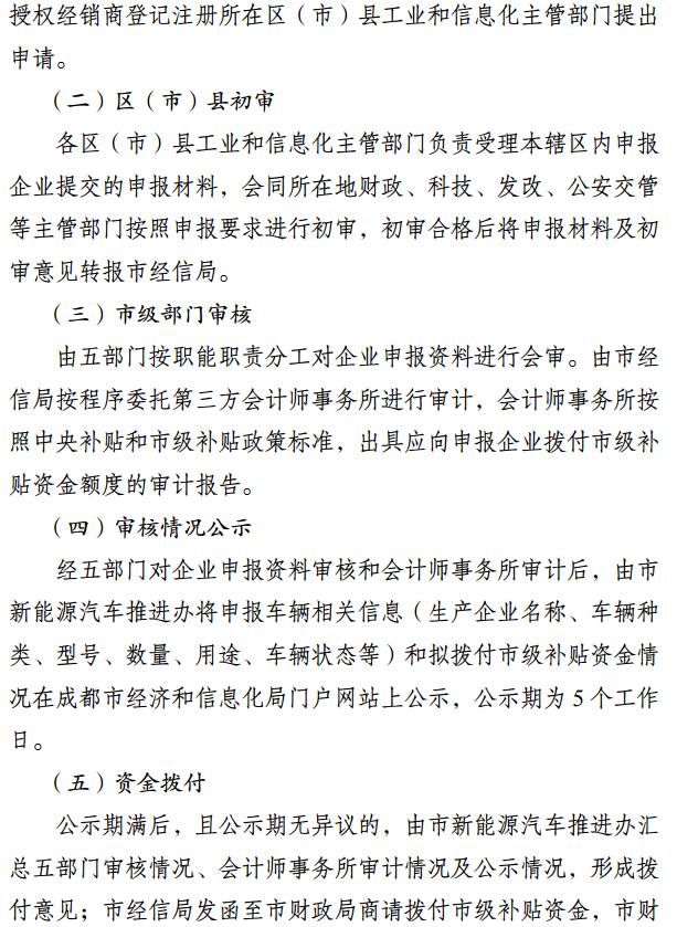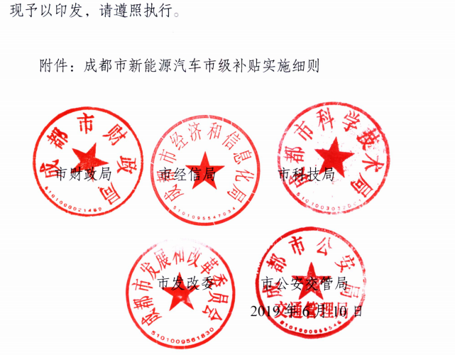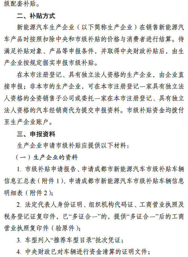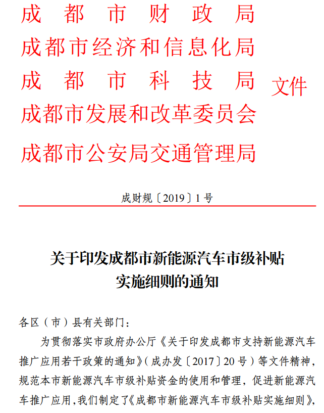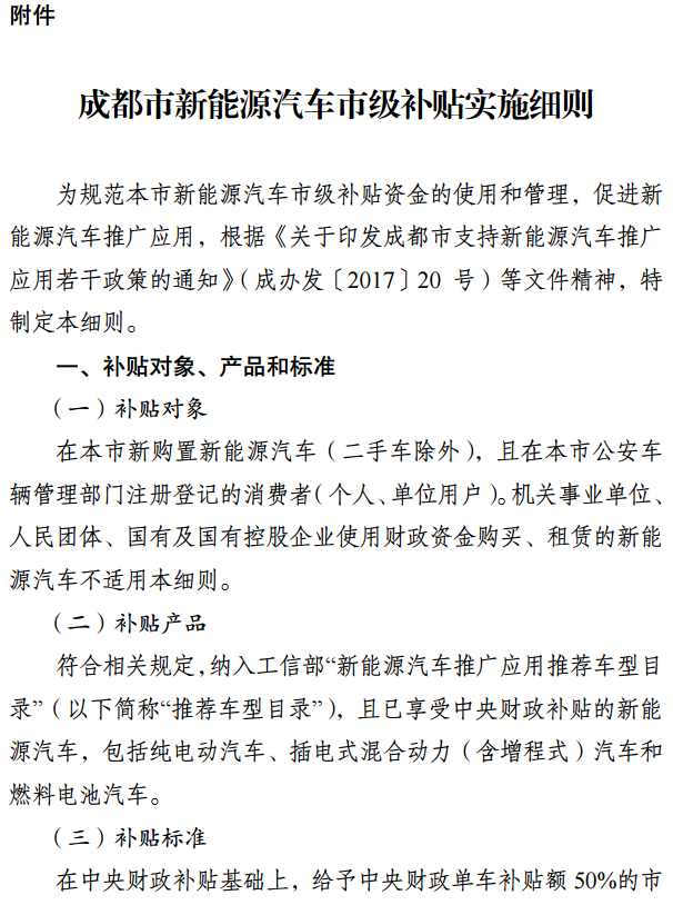 近日,成都市財政局等5部委聯合印發的《關于印發成都市新能源汽車市級補貼實施細則的通知》指出,在中央財政補貼基礎上,給予中央財政單車補貼額50%的市級配套補貼。