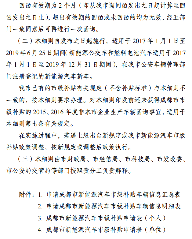 實施細則自發布之日起施行,適用于2017年1月1日至2019年6月25日期間(新能源公交車和燃料電池汽車適用于2017年1月1日至2019年12月31日期間),在成都市公安車輛管理部門注冊登記的新能源汽車新車。