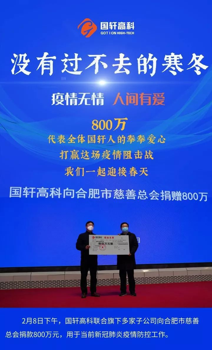 2月8日下午,國軒高科(002074)聯(lián)合旗下多家子公司向合肥市慈善總會捐贈800萬元,用于當(dāng)前疫情防控工作。國軒高科董事長李縝表示,此次向合肥市慈善總會捐款,希望可以為打贏疫情阻擊戰(zhàn)盡一份綿薄之力。