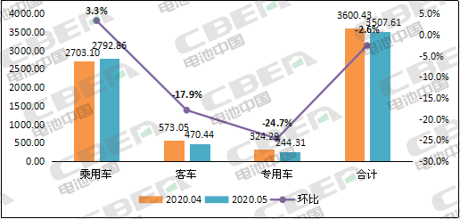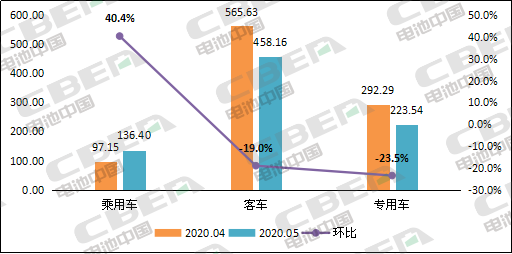 從車輛類型來看,2020年5月新能源乘用車搭載的動力電池裝機量約2.79GWh,環(huán)比增長3.3%,占比79.6%,較上個月提升4.5個百分點;新能源客車搭載的動力電池裝機量約0.47GWh,環(huán)比下降17.9%,占比13.4%,較上個月下滑2.5個百分點;新能源專用車搭載的動力電池裝機量約0.24GWh,環(huán)比下降24.7%,占比7.0%,較上個月下滑2個百分點。
