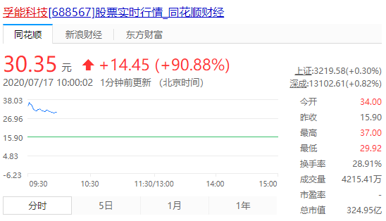 7月17日,孚能科技在上海證券交易所科創(chuàng)板上市(股票代碼:688567),成為科創(chuàng)板新能源汽車動(dòng)力電池第一股,同時(shí)也是中國新能源汽車軟包動(dòng)力電池第一股。截至17日上午10時(shí),孚能科技股價(jià)大漲90.88%,報(bào)30.35元,總市值達(dá)324.95億元。