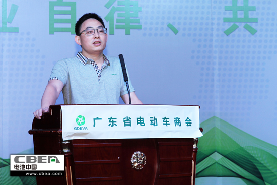 圖為廣東省電動車商會秘書長藍世有介紹商會情況