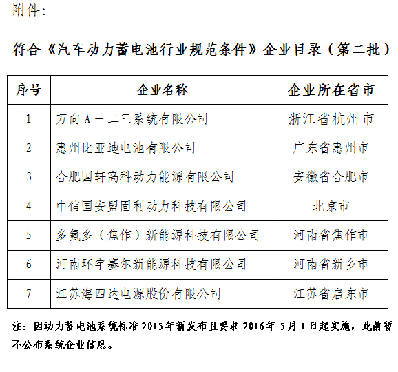 2015年11月11日,工信部于其官方網站發布了符合《汽車動力蓄電池行業規范條件》企業名單(第一批),共有10家企業上榜,如下: