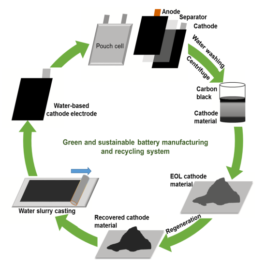 研究人員在電極生產中用水替代了NMP,并從集電器中分離出黑色物質(炭黑和活性物質的混合物),將水溶性粘合劑溶解在水中以實現回收,再將活性物質從炭黑中分離出來,再次鋰化生成電池材料。