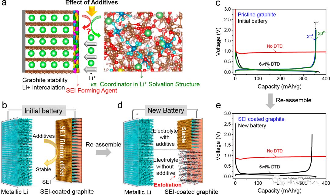 電解液添加劑對石墨負極穩(wěn)定性的影響有爭議的問題如圖1a所示。首先在石墨基鋰離子電池(即石墨與鋰)中研究了含有硫酸乙烯酯(DTD)添加劑的PC基電解液。可以看出,在PC基電解液中使用DTD后石墨的容量穩(wěn)定在353 mAh g-1,其中SEI可以在石墨表面上形成(圖1b),沒有持續(xù)的電解液還原和/或石墨剝離(圖1c)。將幾個循環(huán)后電池拆解,取出該SEI包覆的石墨并組裝新的電池。結果發(fā)現SEI包覆的石墨在含6% DTD的相同電解液中可以連續(xù)工作并有353 mAh g-1容量,但在不含DTD的電解液中卻立即失效。在沒有DTD添加劑的新電池中,SEI包覆的石墨(圖1e)在0.94 V左右均觀察到嚴重的電解液還原和石墨剝離現象。該結果表明,SEI層無法穩(wěn)定石墨以實現可逆的Li+脫嵌。這些結果證實了SEI抑制石墨剝離的能力取決于電解液中是否有足夠的DTD添加劑;影響石墨性能的關鍵因素(例如:Li+脫嵌入或Li+-溶劑共嵌)實際上是電解液的成分。