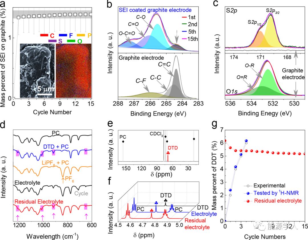 在過去的20年中,許多添加劑(例如:碳酸亞乙烯酯(VC)、LiBOB、金屬離子、鈉鹽或鉀鹽、乙烯基亞硫酸乙烯酯(VES)、1,3-丙烯磺內酯、三氧化硫、磷酸酯、三(三甲基三甲硅烷基)亞磷酸酯和呋喃酮)通常用作SEI成膜劑,可保護石墨陽極,并確保石墨中可逆的Li+脫嵌。在本文中,作者發(fā)現重復充放電過程中添加劑(例如DTD)的消耗很有限。在初始循環(huán)中,SEI在石墨表面上快速形成,然而其重量、形態(tài)或組成沒有明顯變化(圖2a)。XPS分析進一步證實了這種現象。與原始狀態(tài)相比,圖2b, c中石墨電極的C 1s,S 2p和O 1s峰的強度、形狀和擬合顯示出在第一個循環(huán)中與原始狀態(tài)相比有明顯的變化,表明了在第一個循環(huán)中SEI的形成,此后變化很小。