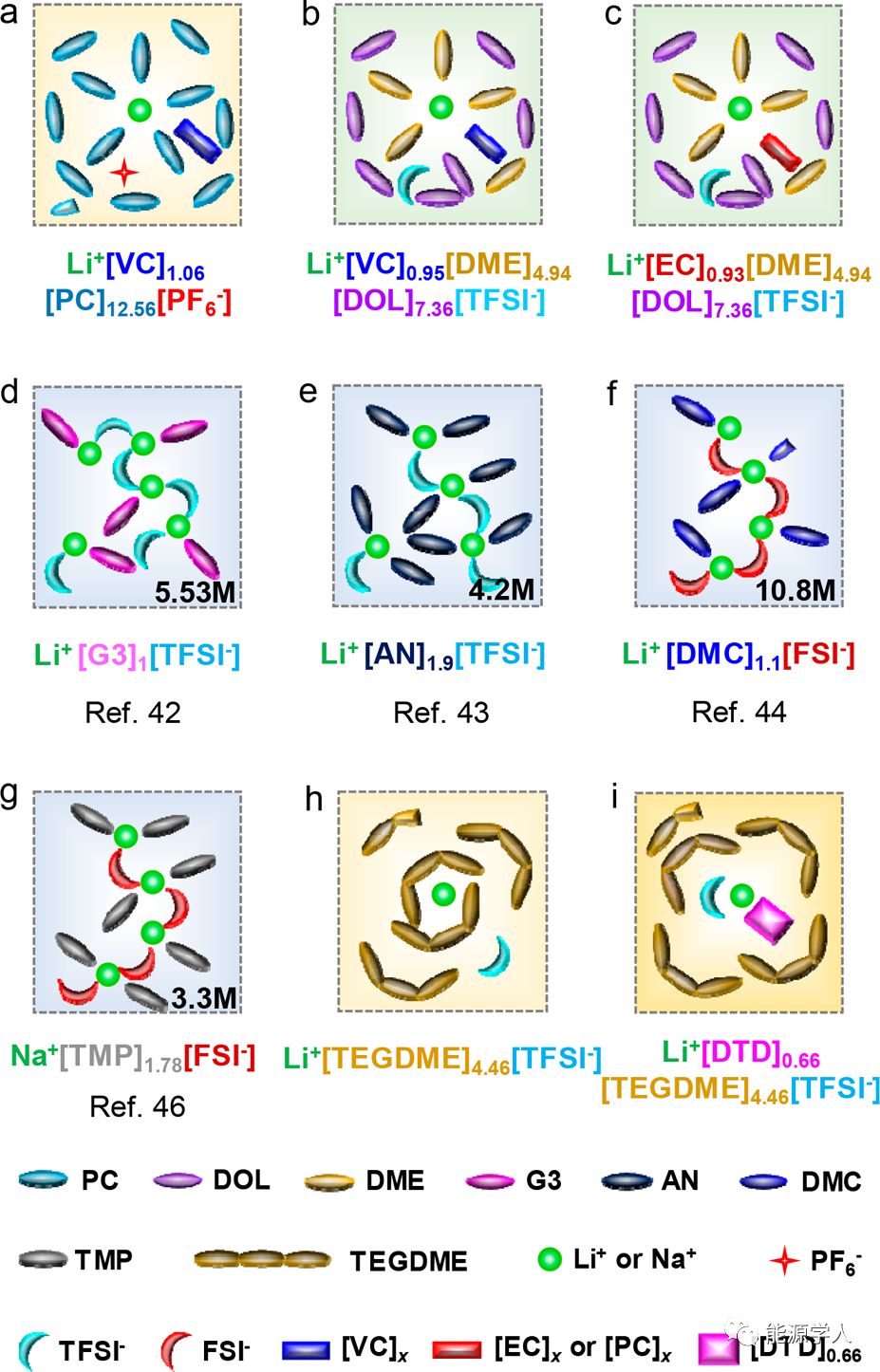 此外,當在PC中的1.0M LiPF6或DOL/DME中的1.0M LiTFSI的電解液中使用不同的添加劑(例如:VC、EC或PC)時,Li+-溶劑的相互作用在圖5a-c中進一步顯示。基于這些結果,提出了另一種觀點,這為石墨在超高濃度電解液體系中的穩(wěn)定性帶來了重要的新見識。結果表明,在較高的鹽濃度下Li+-溶劑相互作用降低或溶劑的配位能力較弱可能是石墨穩(wěn)定的根本原因。換句話說,如果可以通過強配位添加劑(例如DTD)充分削弱Li+-溶劑的相互作用,則SEI效應可能不是最關鍵的因素,并且可能不需要完全聚集。此外,作者研究了與文獻報道的高濃度電解液概念相關的加性效應,發(fā)現高濃度電解液中溶劑/Li+的比例僅為約1-3(即Li+[溶劑]1-3[陰離子],圖5d-g),低于現在的電解液(例如Li+[DTD]x[PC]12.56[PF-]6)和市售電解液中的數量(例如Li+[EC]7.49[DEC]4.12[PF6-], 1.0 M LiPF6-EC/DEC)。因此,廣泛研究的(超高)濃縮電解液概念和所提出的電解液體系中的累加效應代表改變Li+溶劑化結構的不同方式(例如:Li+-溶劑相互作用)。