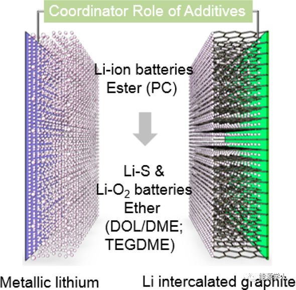 然而,本文中作者證明,石墨負極穩(wěn)定性的提升并非得益于加入添加劑后表面形成穩(wěn)定的SEI膜。作者發(fā)現添加劑的真正作用是改變電解液中的鋰(Li+)溶劑化結構。盡管添加劑會影響SEI的化學成分,但形成的SEI無法穩(wěn)定石墨。研究表明,添加劑在電解液中起配位作用,從而改變了Li+-溶劑的相互作用。因此,添加劑最終決定了Li+離子或Li+團簇的行為。所以,用添加劑后石墨穩(wěn)定性提高的真正原因是電解液本身的化學變化,而不是先前認為的SEI成膜效果。該研究以“New Insight on the Role of Electrolyte Additives in Rechargeable Lithium Ion Batteries”為題發(fā)表在國際頂級期刊ACS Energy Lett.上。
