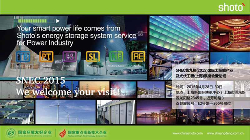 大數(shù)據(jù)時代領(lǐng)先的綠色儲能集成服務(wù)供應(yīng)商,中國領(lǐng)先的新能源高新技術(shù)企業(yè)集團(tuán)——雙登集團(tuán),即將參展2015年4月28-30日在上海新國際博覽中心舉辦的SNEC第九屆(2015)國際太陽能產(chǎn)業(yè)及光伏工程(上海)展覽會及論壇(SNEC PV POWER EXPO 2015),展位號:E2號館—365號展位。