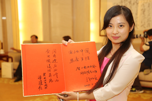 2014年5月29日,電池行業垂直媒體平臺——《電池中國》網站上線新聞發布會在京隆重舉行。圖為網站工作人員展示嘉賓題寫的寄語。