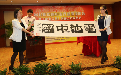 2014年5月29日,電池行業垂直媒體平臺——《電池中國》網站上線新聞發布會在京隆重舉行。圖為網站工作人員在新聞發布會現場展示知名書法家為網站題寫的站名。