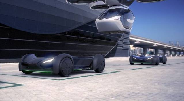 與地面模塊相對應的飛行模塊,則是由一架直徑為4.4米,4個旋翼的無人機操控,無人機的輪子旋轉產生巨大的升力,中間的凹槽固定駕駛艙車身,可垂直起降。無可通過AI平臺和手機APP控制,空中推進模塊采取電力驅動。