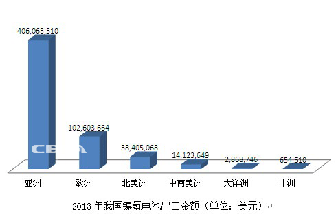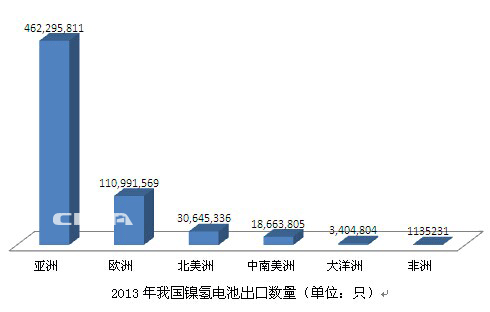 據中國化學與物理電源行業協會發布的《2013年我國電池產業出口數據》,2013年我國鎳氫電池的出口量為6.27億只,2012年出口量為6.9億只,同比減少9.1%。2013年,我國鎳氫電池出口額為5.64億美元,而2012年出口額為6.51億美元,同比減少13.4%。其中,出口亞洲金額同比減少14.2%,出口歐洲金額同比減少8.6%,出口北美金額同比減少19.7%。出口中南美洲金額同比減少2.5%。