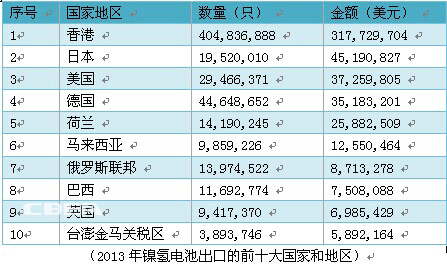 2013年我國鎳氫電池出口地區中,向香港地區的數量和出口金額均排名第一,共向香港地區出口鎳氫電池404,836,888只,出口金額達到317,729,704美元。