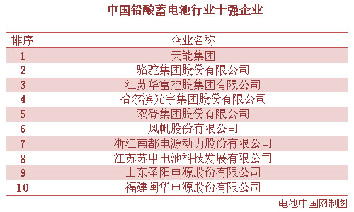 日前,中國輕工業(yè)聯(lián)合會發(fā)布2014年度中國鉛酸蓄電池行業(yè)十強企業(yè)榜。該榜單由中國電池協(xié)會推薦,由中國輕工業(yè)聯(lián)合會對參評企業(yè)2014年度主營業(yè)務(wù)收入、利潤等指標進行綜合評定得出。