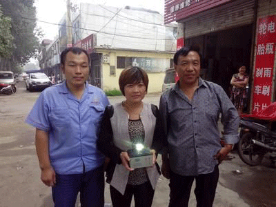 天能集團(tuán)匯源電池代理商相其偉(右)、高吉電動車維修部老板高吉(左)、消費者高麗(中)三人合影