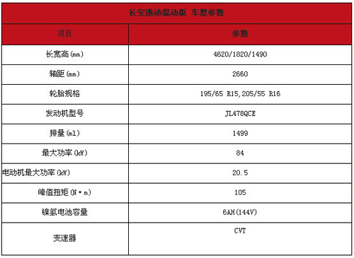 動(dòng)力方面,逸動(dòng)混動(dòng)版搭載汽油機(jī)和電動(dòng)機(jī)加電池組成的ISG混合動(dòng)力系統(tǒng),其中汽油機(jī)部分選擇的是長(zhǎng)安汽車(微博)全新的1.5L D-VVT Blue Core發(fā)動(dòng)機(jī),最大功率84kW;電動(dòng)機(jī)最大功率20.5kW,而鎳氫電池的電壓為為144V,容量為6AH。傳動(dòng)系統(tǒng)上,新車將配CVT自動(dòng)變速器。