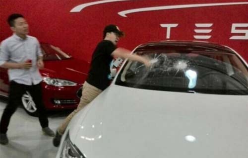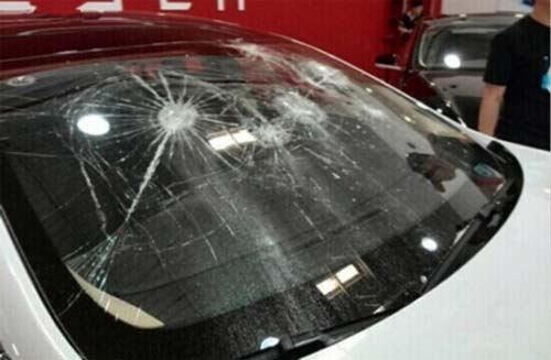 于鑫泉早已沒有了當(dāng)初的興奮。從特斯拉銷售人員手中接過車鑰匙之后,他迅速打開車前蓋,拿出做牽引車輛用的黑色鉤子,向嶄新的特斯拉Model S擋風(fēng)玻璃狠狠地砸了下去。現(xiàn)場(chǎng)所有人都愣住了。