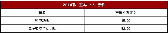 24日,寶馬中國(guó)正式公布了寶馬i3的售價(jià),未來(lái)新車上市后將推出純電動(dòng)版和增程式混合動(dòng)力版兩款車型,售價(jià)分別為45.0萬(wàn)元和52.0萬(wàn)元。詳細(xì)售價(jià)請(qǐng)見(jiàn)下表: