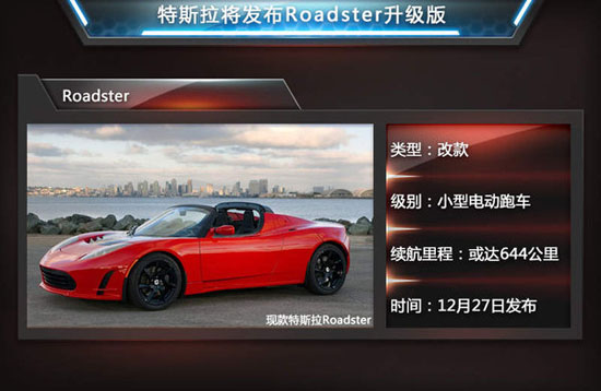 特斯拉Roadster是全球首款量產版電動敞篷跑車,其采用鋰電池技術,每次充滿電可行駛393公里,百公里加速時間為3.7秒,每公里耗電量0.135千瓦時。而在特斯拉Model S上市后,人們的注意力全被其所吸引,Roadster也很長時間沒有再被提及。隨著特斯拉CEO Elon Musk宣布將推出升級版Roadster,再次吊足了消費者胃口。