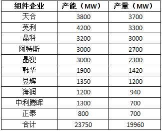 組件環(huán)節(jié),天合、英利、晶科、阿特斯、晶澳、韓華、昱輝、海潤、中利騰暉、正泰等十家企業(yè)的總產(chǎn)能達到23,750MW,總產(chǎn)量達到19,960MW。