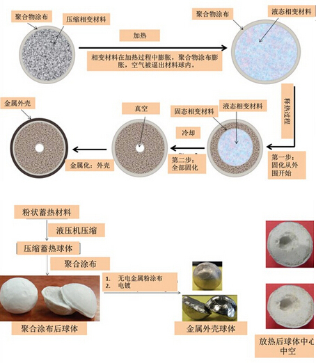 對于該儲熱球的制造和封裝工序,研究人員首先采用液壓機將這種粉狀相變蓄熱材料壓縮,然后用一種低成本、可硬化并具有高滲透率的聚合物涂布將壓縮后的相變材料包裹起來,再通過加熱工序,使相變材料膨脹,聚合物涂布膨脹將空氣逼出材料球內,形成真空。再通過放熱過程,相變材料在球體內由外向內冷卻成為固態,因空氣在加熱過程中被逼出,中心部位形成真空狀態,然后采用電鍍或高溫燒結技術將包裹起來的相變儲熱球封裝一層金屬外殼或者陶瓷外殼。(見圖1)
