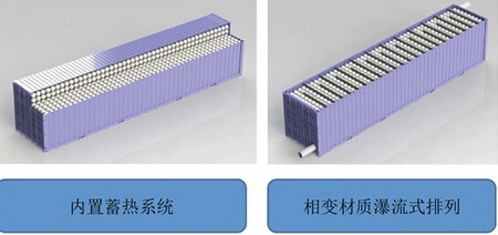 無數(shù)個(gè)儲(chǔ)熱球次序排列在集裝箱式的儲(chǔ)熱箱體中,就形成了一種獨(dú)特的集裝箱式相變儲(chǔ)熱系統(tǒng)。目前,儲(chǔ)熱球的排列方式有內(nèi)置式和相變瀑流式兩種,可根據(jù)項(xiàng)目場(chǎng)地的大小選擇不同的排列方式,兩種儲(chǔ)熱箱在制作費(fèi)用方面會(huì)有所差異。(見圖2)