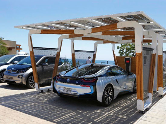 再比如寶馬,大概覺得自家的i系列車型太過(guò)華麗,傳統(tǒng)的充電方式實(shí)在難以匹配,于是,他們?yōu)閕系列車型設(shè)計(jì)了專門的太陽(yáng)能車棚。
