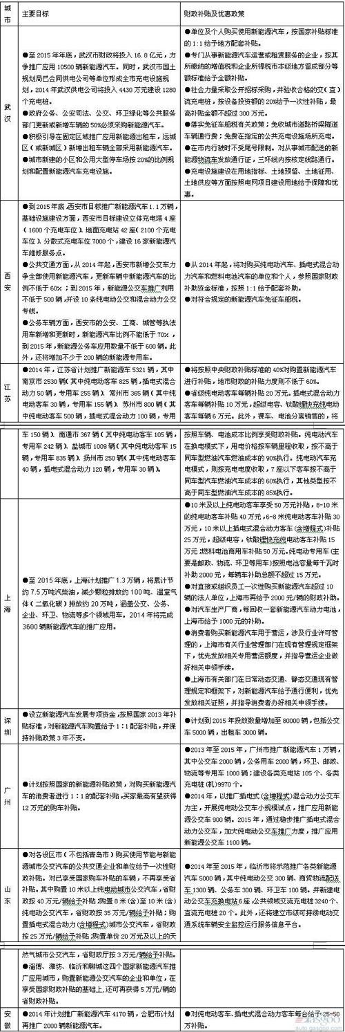 2014年,財政部、科技部、工信部、發(fā)改委(以下簡稱四部委)聯(lián)合發(fā)布新能源汽車補貼標準調(diào)整計劃,并于同期公布第二批新能源汽車推廣應用城市名單,全國共有12個區(qū)域的26個城市入圍。隨后,多個省市密集發(fā)布新能源汽車補貼政策細則,包括新能源汽車推廣目標、充換電等基礎設施建設規(guī)劃、新能源汽車補貼標準及相關(guān)優(yōu)惠政策等。本文將以商用車為主線,以表格形式對各地關(guān)于新能源政策進行了匯總。