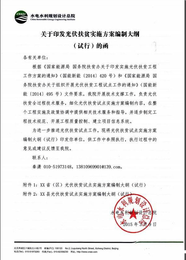為持續(xù)推進(jìn)、完善光伏扶貧工作進(jìn)展,2015年3月9日,國(guó)家能源局新能源司下發(fā)《關(guān)于轉(zhuǎn)發(fā)光伏扶貧試點(diǎn)實(shí)施方案編制大綱的函》,為各地編制光伏扶貧實(shí)施方案提供參考依據(jù)。