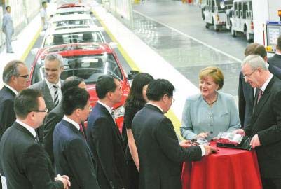 走進公司的展示區,默克爾看到一輛锃亮的全新捷達停放在面前,快步上前拉開車門,坐到駕駛位子上體驗。約一分鐘后,她從車里出來,一邊觀看沙盤,一邊聽取公司發展情況介紹。
