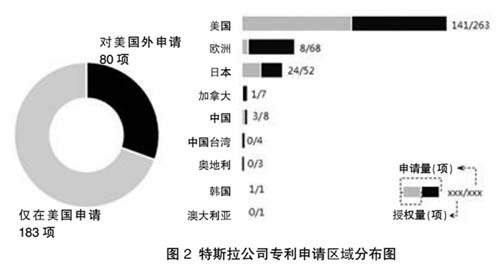 圖2顯示了特斯拉公司專利申請區域分布情況,從圖中可知,其263項發明專利申請主要集中在美國,并且其中有183項僅在美國提交了專利申請。由此可見,特斯拉公司將美國作為其最重要的市場。