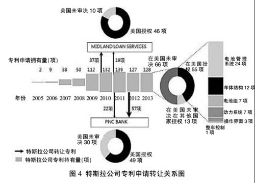 埃倫·馬斯克宣布特斯拉公司將開放所有專利技術(shù),那么特斯拉公司真正擁有多少專利呢?筆者對特斯拉公司的專利權(quán)屬轉(zhuǎn)讓情況進行了深入檢索統(tǒng)計分析,發(fā)現(xiàn)近年來特斯拉公司對所持有專利進行了很多專利權(quán)轉(zhuǎn)讓。如圖4中所示,從INCOPAT數(shù)據(jù)庫獲知,在2010年至2012年間,特斯拉公司名下的271項專利申請中有超過135項發(fā)生過專利權(quán)屬轉(zhuǎn)讓(assignment),其中79項轉(zhuǎn)讓給了PNC銀行協(xié)會(PNC BANK,NATIONAL ASSOCIATION),56項轉(zhuǎn)讓給了米德蘭貸款服務(wù)公司(MIDLAND LOAN SERVICES,INC.),并且有20項專利申請涉及兩次權(quán)利轉(zhuǎn)讓,都是先轉(zhuǎn)給米德蘭貸款服務(wù)公司,再轉(zhuǎn)讓給了PNC銀行協(xié)會。