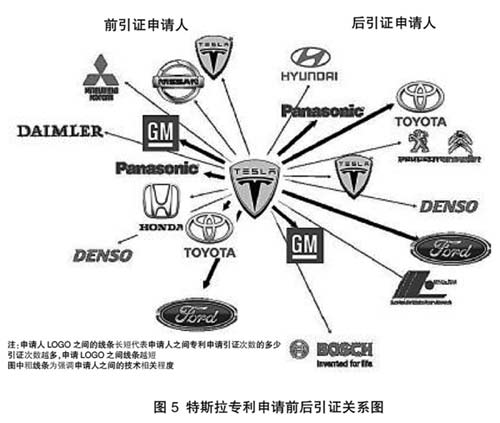 筆者又繼續(xù)對特斯拉公司與電動汽車相關(guān)企業(yè)的技術(shù)關(guān)聯(lián)性進行了研究。將特斯拉公司所持有的美國專利進行引證和被引證分析后,得出了如圖5所示的特斯拉專利申請前后引證關(guān)系圖。