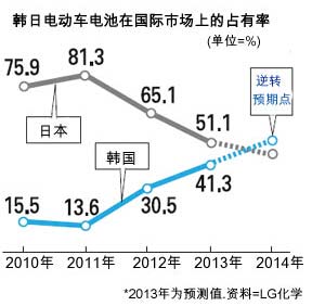 韓國汽車電池市占率正在趕超日本,成為全球第一。市場調查企業B3稱,去年世界電動車電池銷售量的51.1%都是日本企業的,韓國占41.3%。早期的電池市場日本占了70%以上,業內人士預期,今年韓國開始趕超日本,估計在小型電池和中大型電池上都會成為第一名。