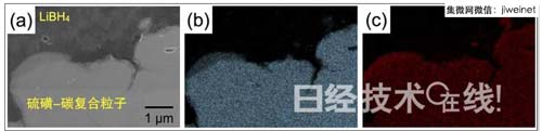 圖2:C-S復合粒子/LiBH4正極層截面的場發射掃描電子顯微鏡圖像(a)、S的分布(b)、C的分布(c)。可以看出,在C-S復合粒子的內部,C與S呈相互高分散狀態。而且,C-S復合粒子與LiBH4緊貼在一起,形成了良好的接觸界面。