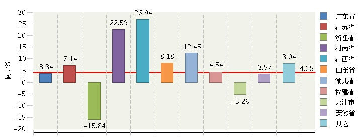 2014年1~6月全國電池行業(yè)主營業(yè)務收入同比增長較快的地區(qū)是江西、河南、湖北、地區(qū)。(參見圖10)