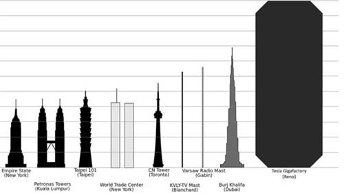 特斯拉在內華達的超級電池工廠即將開工,那么這個工廠到底有多大?最近有好事的美國人就做了一張圖,這樣看起來,這個工廠還確實挺大的。當然,下面這圖上的特斯拉工廠,并不是在表示自己的高度。而是做圖的兄弟,將這座工廠給豎了起來。可以看到,如果是目前世界上最高的829.8米的迪拜哈里法塔,將它橫放在特斯拉的工廠里,它還差270才能抵到工廠的另一頭。