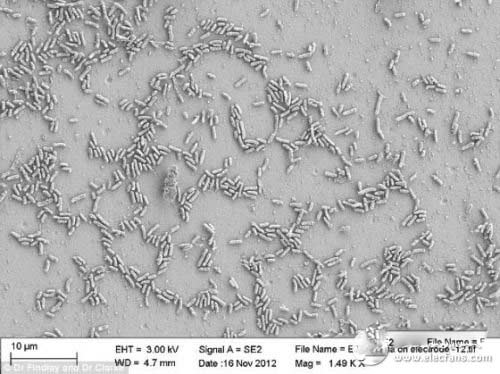 通過顯微鏡看到,海洋細菌希瓦氏菌的合成版本與碳電極發生互動