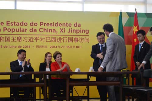 簽署儀式在巴西當(dāng)?shù)貢r(shí)間7月17日舉行,國家主席習(xí)近平和和巴西總統(tǒng)羅塞夫在總統(tǒng)府共同見證。在35家簽約企業(yè)中比亞迪是唯一一家中國新能源汽車企業(yè)。