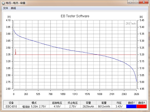 可以看到即使是2C(5.2A)大電流放電,力神2600的容量依然達到2600mAh以上,且與1C容量相差無幾,證明力神2600的大電流放電性能十分優(yōu)異。