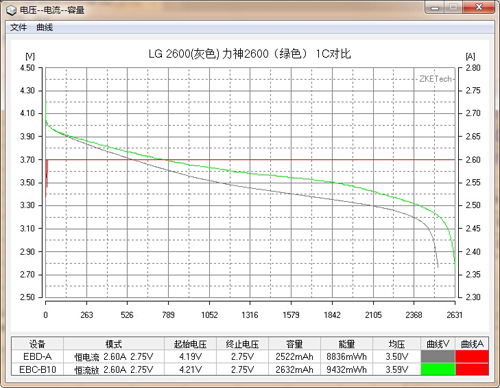 再對比一下LG 2600和力神2600的1C(2.6A)放電曲線。可以發(fā)現(xiàn),力神2600的放電性能完全不遜色于LG 2600mAh 18650,甚至還顯著高于LG 2600。得益于力神的電壓平臺更高,雖然都是2600mAh,但能量明顯要高于LG。