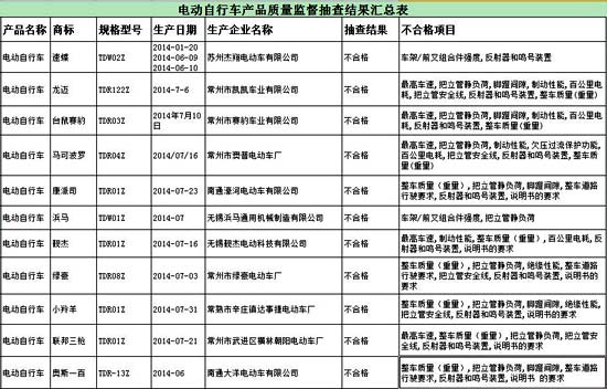 在抽查和監(jiān)測(cè)總體情況方面,本次共抽查我省生產(chǎn)企業(yè)的電動(dòng)自行車215批次,小羚羊、速蝶、龍邁等11批次不合格,合格率為94.9%;江蘇省生產(chǎn)的蓄電池41批次,合格率為100%;抽查充電器23批次,合格20批次,合格率為87%。