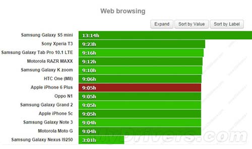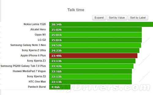 另外gsmarena表示在其大屏智能手機續(xù)航數據庫中,iPhone 6 Plus的續(xù)航表現可以排名前十。
