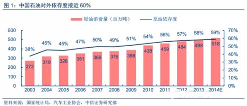 中國原油還能讓汽車業“奔跑”多久?一邊是中國60%的原油對外依存度,一邊是快速增長的汽車保有量和居高不下的平均油耗。中國已連續5年成為全球第一大汽車消費國,假設單車油耗不變,到2018年,中國汽車保有量和車用原油量再翻一倍,中國原油對外依存度或超過70%!中國能源結構多煤少油,新能源汽車可降低石油消耗,但考慮到其偏低的銷量占比和普及速度,仍不足以改變中國車用能源結構。