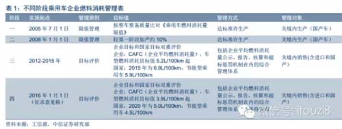 企業平均油耗標準是核心考核指標,2015年乘用車平均燃料消耗量降至6.9升/百公里,2020年降至5.0升/百公里。根據《節能與新能源汽車產業發展規劃(2012-2020年)》,2015年生產的乘用車平均燃料消耗量需要降至6.9升/百公里(第三階段油耗),到2020年降至5.0升/百公里(第四階段油耗)。此外,節能乘用車燃料消耗量2015年要降至5.9升/百公里,2020年要降至4.5升/百公里。