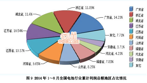 2014年1~8月全國電池行業利潤較高的產區主要集中在廣東、浙江、湖北、江西、江蘇、河南、山東、福建、河北、安徽地區,10 個地區完成利潤總額占全國的92.29%。(參見圖9)