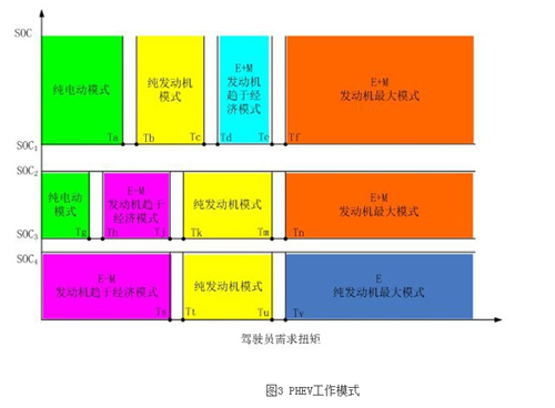 圖2是兩種典型的PHEV動力系統結構,比亞迪秦與圖2左圖相同。筆者研究團隊制定了圖2結構的工作模式,如圖3所示,根據蓄電池SOC和駕駛員需求扭矩(根據踏板開度和車速解析獲得),即可確定出PHEV的工作模式,縱軸SOC和橫軸需求扭矩之間白色帶寬是為了防止工作模式的頻繁跳變。圖3中SOC1和SOC2在30%左右,SOC3和SOC4在10%左右;SOC大于SOC1以及處于SOC2和SOC3之間的工作模式是最常用的工作模式,可使電池SOC基本維持在30%左右;設置SOC3和SOC4的目的是為了考慮“Auto”和“HEV”模式下,低速純電動和需求扭矩大(爬陡坡和急加速)等特殊工況的動力需求;但當SOC低于10%時電池不能放電,一方面由于此時電池放電效率低,另外由于電池SOC誤差較大(可達8%)、此時電池已經處于無電狀態。