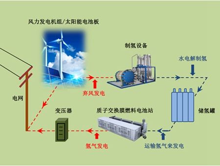 作為地球上最輕的元素,氫具有最高的能源密度,可以通過電將水分解產生。如果水電解槽與風力發電或太陽能電池板集成,氫氣作為能量儲存的媒介可由多余的風力、太陽能發電產生。在電網高峰時段,質子交換膜(PEM)燃料電池站發電來滿足電網要求。由于PEM燃料電池發電過程不涉及氫氧燃燒,因而不受卡諾循環的限制,能量轉換率高;發電時不產生污染,發電單元模塊化,可靠性高,組裝和維修都很方便,工作時也沒有噪音。所以,質子交換膜燃料電池電源是一種清潔、高效的綠色環保電源。