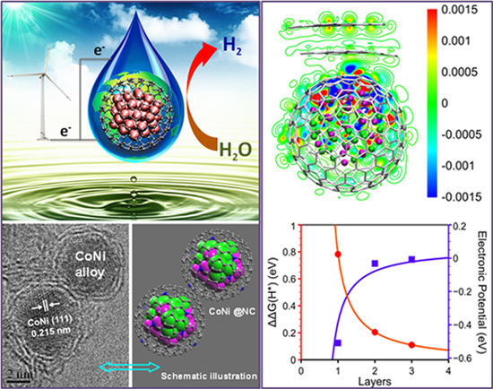 近日,中國(guó)科學(xué)院大連化學(xué)物理研究所催化基礎(chǔ)國(guó)家重點(diǎn)實(shí)驗(yàn)室副研究員鄧德會(huì)和中科院院士包信和帶領(lǐng)的研究團(tuán)隊(duì)在長(zhǎng)期深入研究納米碳材料催化的基礎(chǔ)上,通過(guò)創(chuàng)新二維納米碳材料(類石墨烯材料)的制備策略和合成方法,成功實(shí)現(xiàn)了均一的超薄石墨烯殼層(一般為1-3碳層)對(duì)3d過(guò)渡金屬納米粒子的包裹和封裝。理論模擬和實(shí)驗(yàn)研究表明,在催化反應(yīng)過(guò)程中,活性金屬納米粒子催化劑在納米碳空腔中的封裝阻斷了其與苛刻反應(yīng)環(huán)境(如酸性、堿性和強(qiáng)氧化性等)的直接接觸,有效地延緩和阻止了催化劑的失活,同時(shí),被包裹的納米金屬的活性價(jià)電子通過(guò)與類石墨烯碳層的相互作用“穿透(penetration)”到外表面,實(shí)現(xiàn)了高效催化反應(yīng)。基于這一原理制備得到的石墨烯碳層封裝的納米鈷-鎳催化劑應(yīng)用于強(qiáng)酸性條件下電解水制氫反應(yīng)(HER),表現(xiàn)出了優(yōu)異的催化活性和穩(wěn)定性,在電流密度為10 mA/cm2 的條件下,電解水陰極過(guò)電位僅為142 mV,性能接近于通常采用的40%Pt/C催化劑,相關(guān)結(jié)果于近日在《德國(guó)應(yīng)用化學(xué)》(Angew. Chem. Int. Ed., 2015, DOI: 10.1002/anie.201409524)在線發(fā)表,并被該期刊選為“熱點(diǎn)文章(Hot Paper)”。